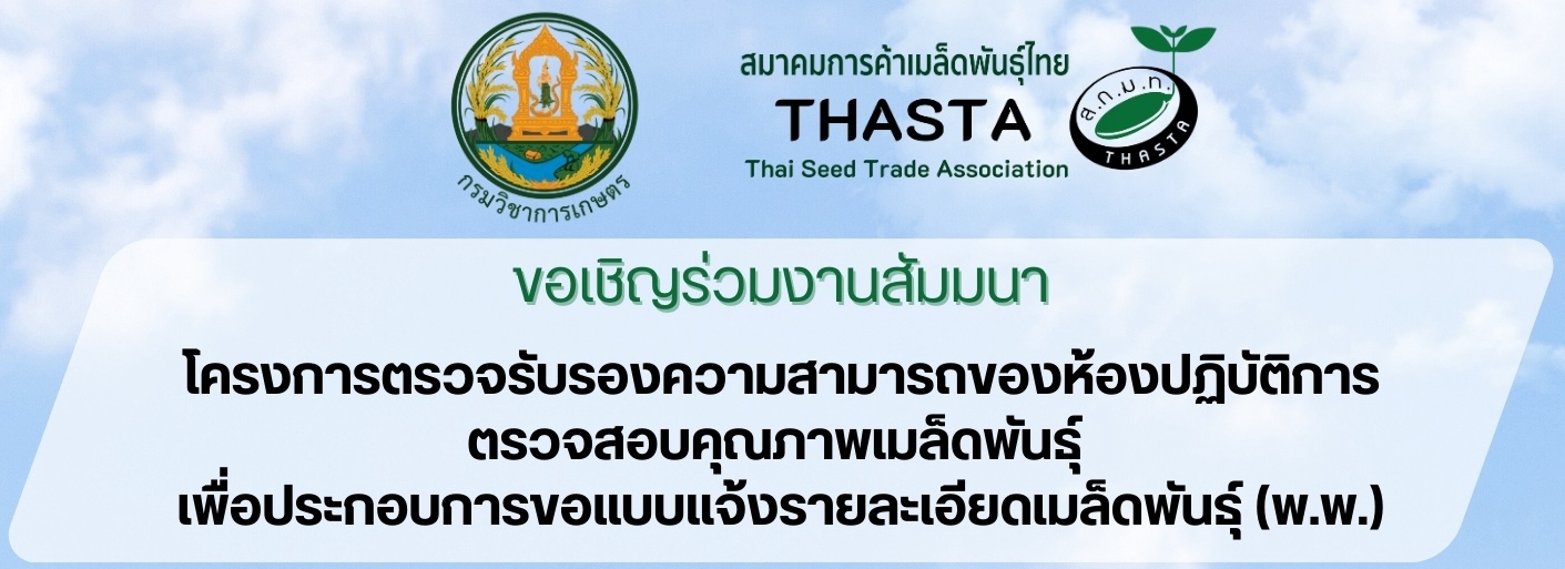 SPS Notification Read More » 01/08/2026 กิจกรรม สมาคมฯ เยี่ยมชมแปลงสาธิตและบูธจัดแสดงสินค้า “เมล็ดพันธุ์ ตรา ตะวันต้นกล้า” Read More » 12/04/2025 กิจกรรม Genome Editing Read More » 12/02/2025 กิจกรรม โครงการฝึกอบรมการตรวจสอบคุณภาพเมล็ดพันธุ์ควบคุม ปี2568 Read More » 11/10/2025 กิจกรรม THASTA Golf2025 Read More » 08/28/2025 กิจกรรม อธิบดีกรมวิชาการเกษตร Kick Off ขับเคลื่อนการอนุญาตให้เอกชนหรือภาคส่วนอื่นเป็นผู้ตรวจสอบแปลงปลูกพืชเพื่อผลิตเมล็ดพันธุ์ Read More » 07/22/2025 กิจกรรม งานเลี้ยงสังสรรค์ชาวเมล็ดพันธุ์ Read More » 05/16/2025 กิจกรรม Field Inspection Accreditation Workshop Read More » 11/28/2024 กิจกรรม การฝึกอบรมการตรวจสอบเมล็ดพันธุ์พืชควบคุม Read More » 11/20/2024 กิจกรรม Seed Certificate Read More » 11/06/2024 กิจกรรม Seed Certificate Project Read More » 10/16/2024 กิจกรรม โครงการฯ ปรับปรุง พรบ.พันธุ์พืช Read More » 09/16/2024 กิจกรรม THASTA Golf 2024 #กอล์ฟเชื่อมความสัมพันธ์ Read More » 08/27/2024 กิจกรรม IGNITE Thailand Read More » 07/02/2024 กิจกรรม Kaset Together : Gene Editing Read More » 02/12/2024 กิจกรรม ป้องกัน: Seed Processing Technology Workshop Read More » 01/31/2024 กิจกรรม Gene Editing_29-Jan-2024 Read More » 01/29/2024 กิจกรรม Gene Editing_24-Jan-2024 Read More » 01/29/2024 กิจกรรม Statistics15Y Read More » 12/22/2023 กิจกรรม สัมมนาเรื่อง UPOV convention และ พรบ. คุ้มครองพันธ์ุพืช พ.ศ. 2542 Read More » 12/08/2023 กิจกรรม THASTA INTERNATIONAL STUDY TOUR 2023: TAIWAN SEED Read More » 08/22/2023 กิจกรรม ประชุมกับคณะกรรมาธิการเกษตรและสหกรณ์ วุฒิสภาา เพื่อให้ข้อมูลและความคิดเห็นในฐานะภาคเอกชนที่อาจได้ผลกระทบจาก พรบ.ที่เกี่ยวข้อง 3 ฉบับ Read More » 07/26/2023 กิจกรรม การฝึกอบรมตรวจสอบคุณภาพเมล็ดพันธุ์พืชควบคุม ปี2566 (เปิดรับสมัครแล้ว) Read More » 06/07/2023 กิจกรรม ประชุมใหญ่สามัญประจำปี 2565 และงานเลี้ยงฉลองครบรอบ 20 ปี Read More » 04/20/2023 กิจกรรม งานประชุมเมล็ดพันธุ์พืชแห่งเอเชีย ประจำปี 2022 Read More » 11/14/2022 กิจกรรม โครงการลดก๊าซเรือนกระจกในห่วงโซ่อุตสาหกรรมปศุสัตว์ไทย Read More » 08/08/2022 กิจกรรม Cucurbits_Workshop Read More » 07/22/2022 กิจกรรม Plant variety protection (PVP) workshop – Session 1-2 # View Record # Read More » 05/11/2022 กิจกรรม กรมวิชาการเกษตรดันไทยทะยานศูนย์กลางเมล็ดพันธุ์ Read More » 04/29/2022 กิจกรรม ร่วมแสดงความยินดีกับอธิบดีกรมวิชาการเกษตรท่านใหม่ Read More » 04/04/2022 กิจกรรม โครงการธรรมชาติปลอดภัยฯ คนพร้าวรักษ์ป่า อช.ศรีลานนา Read More » 03/28/2022 กิจกรรม ประชุมใหญ่สามัญประจำปี 2564 Read More » 03/08/2022 กิจกรรม ลงนามข้อตกลง การจัดงาน Asian Seed Congress 2022 Read More » 01/20/2022 กิจกรรม โครงการส่งเสริมการปลูกข้าวโพดเลี้ยงสัตว์หลังฤดูทำนาในปี 2564-2565 Read More » 12/28/2021 กิจกรรม ส่งมอบเมล็ดพันธุ์ พริก ดาวเรือง , สควอช , ฟักทองญี่ปุ่น Read More » 12/01/2021 กิจกรรม Seed_Online Read More » 10/07/2021 กิจกรรม โครงการรณรงค์ การดูแลรักษาความสะอาดแปลงผลิตให้ยั่งยืน Read More » 09/29/2021 กิจกรรม ประชุมใหญ่สามัญประจำปี Read More » 03/24/2021 กิจกรรม โครงการพัฒนาห้องปฎิบัติการและบุคลากร : การเปรียบเทียบความชำนาญการตรวจสอบคุณภาพเมล็ดพันธุ์ ปี 2563 Read More » 11/30/2020 กิจกรรม โครงการผักดีเพื่อน้อง Read More » 09/25/2020